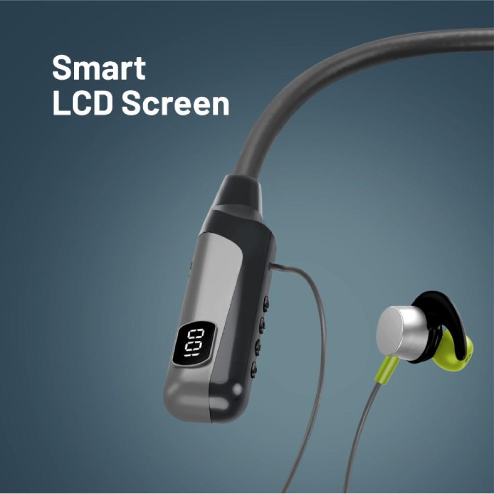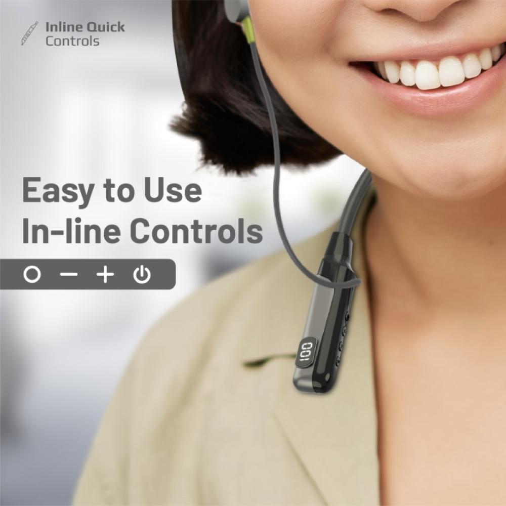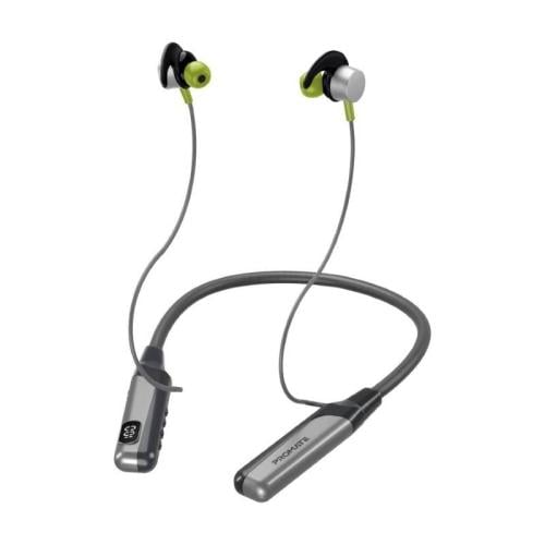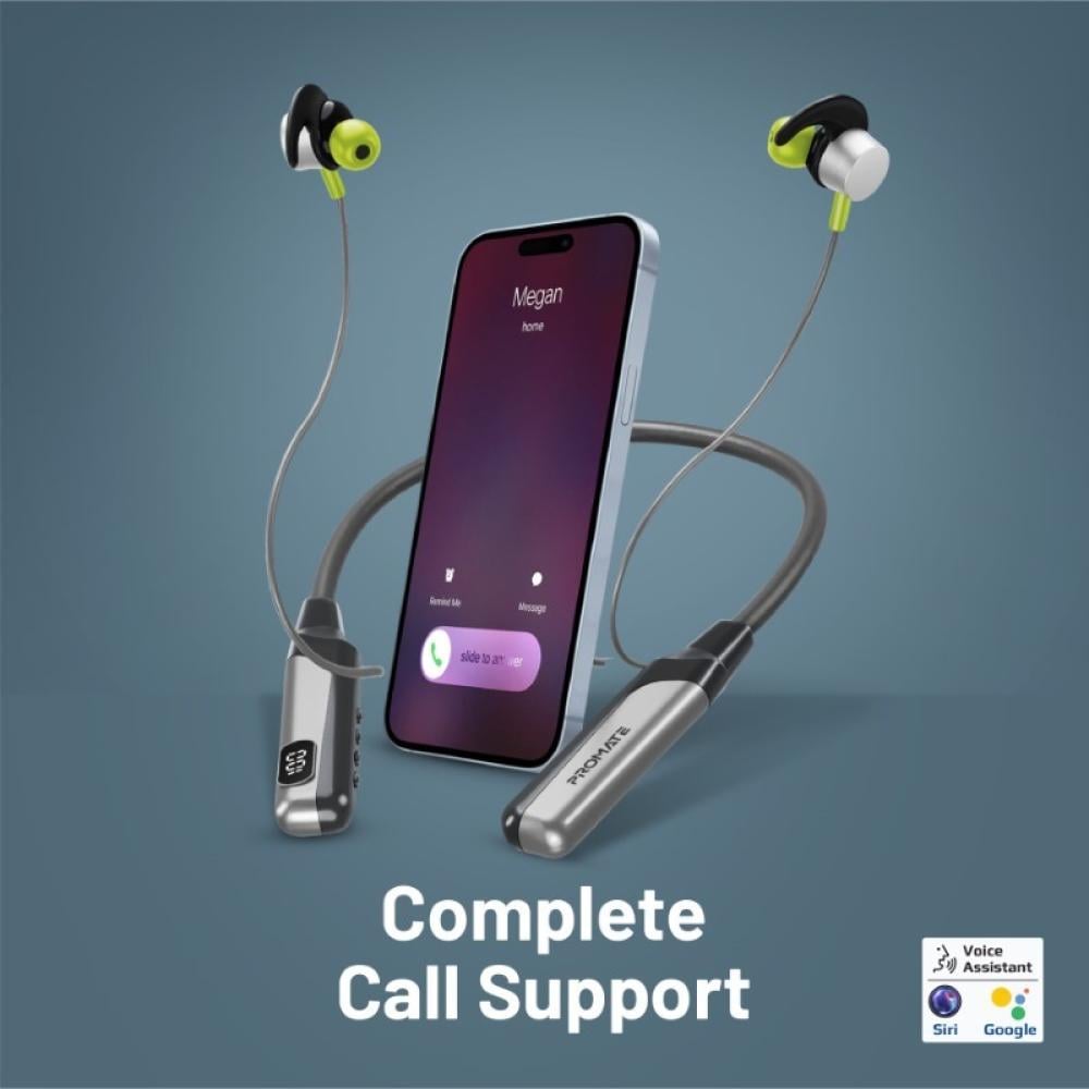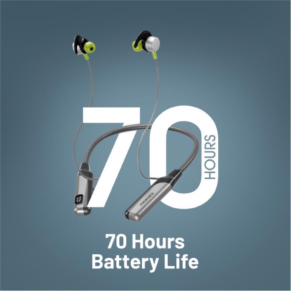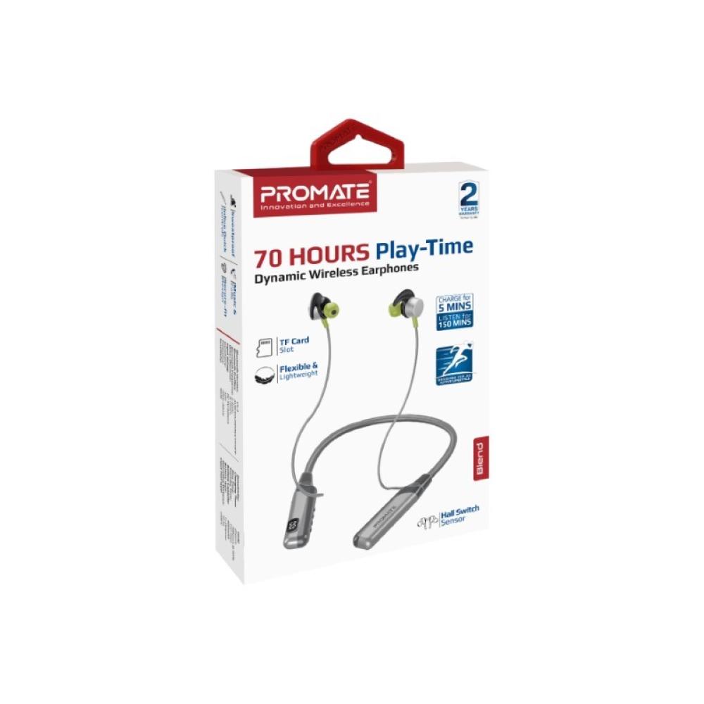 سماعات الرقبة اللاسلكية Promate Blend. صُممت هذه السماعات لتزيد من حماسك أثناء التمارين مع صوت عالي الدقة وثبات مريح. مع تشغيل يصل إلى 70 ساعة وشاشة LCD مدمجة لمتابعة حالة البطارية، يمكنك الاستماع إلى الموسيقى طوال اليوم. تحكم بالمكالمات والموسيقى بسهولة باستخدام وحدة التحكم المدمجة، كما يمكنك تحميل ملفات الموسيقى على بطاقة TF لتستمتع بالترفيه المستمر. عِش تجربة صوتية مذهلة مع Blend.