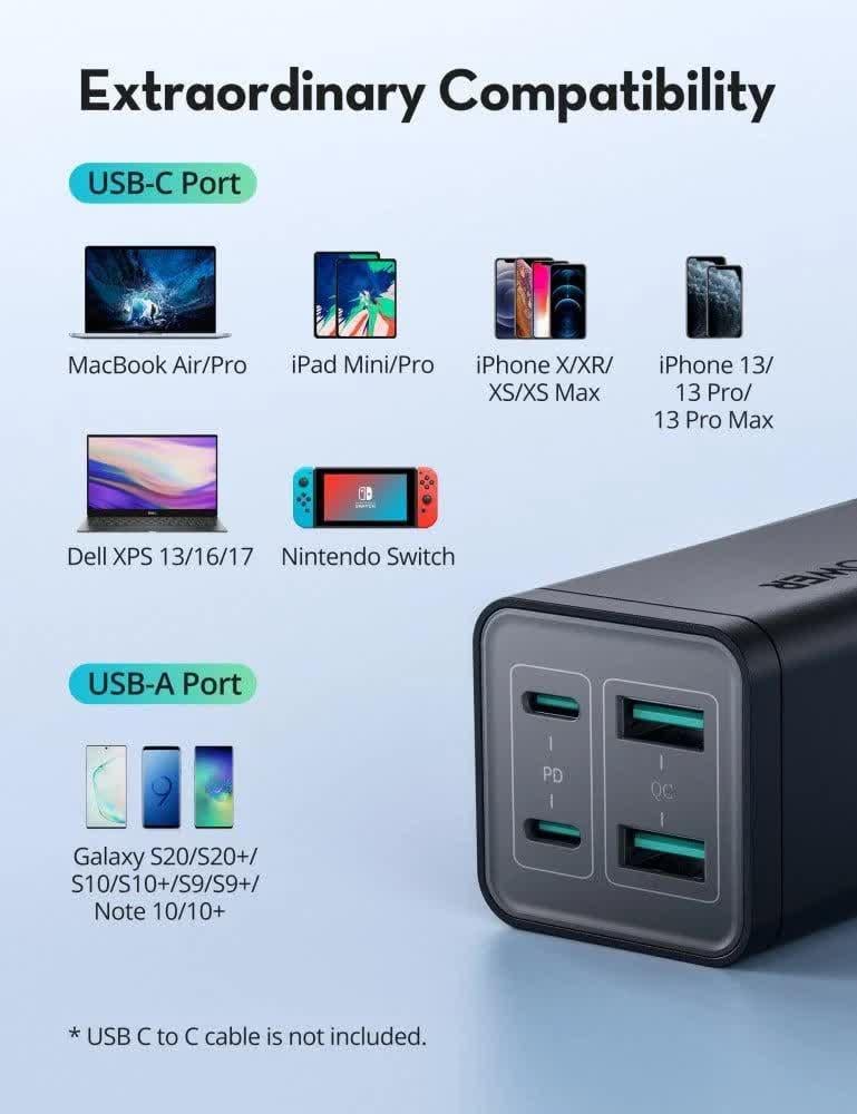 - يدعم Power Delivery لأجهزة iPhone، iPad، MacBook، وQuick Charge 3.0 لأجهزة Galaxy وHuawei.