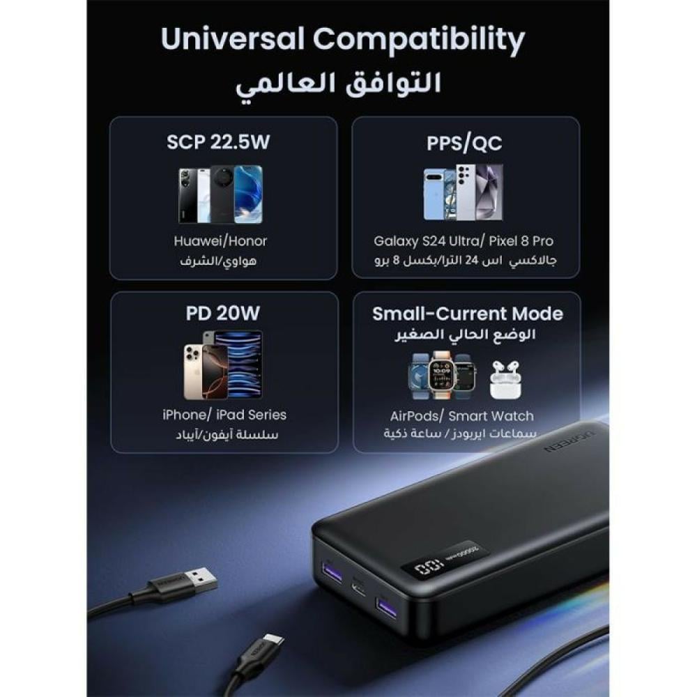 شحن آمن وسريع: يتميز شاحن باور بانك يوجرين بوجود IC تحكم ذكي، والذي يمكنه التعرف تلقائيًا وضبط التيار والجهد بذكاء ليناسب كل جهاز، مما يمنع بشكل فعال الشحن الزائد والجهد الزائد والتيار الزائد والدوائر القصيرة ولا توجد مخاطر خفية في الاستخدام.