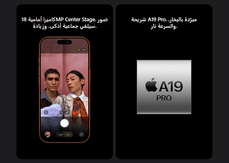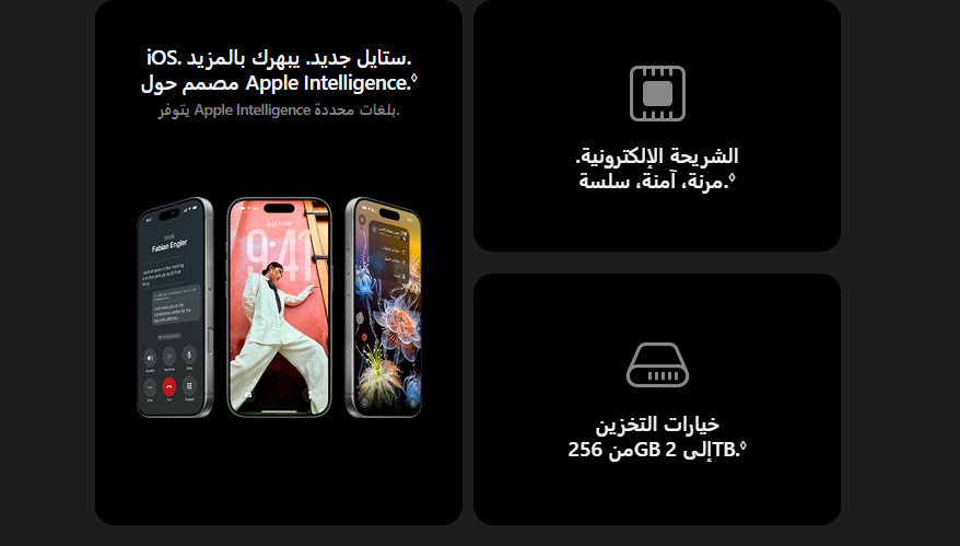 - Apple Intelligence: يتوفر في إصدار تجريبي. قد لا تتوفر بعض الميزات في كل المناطق أو بكل اللغات. لمعرفة المزيد عن توفر الميزات واللغات ومتطلبات النظام، تفضل بزيارة support.apple.com/ar-sa/121115