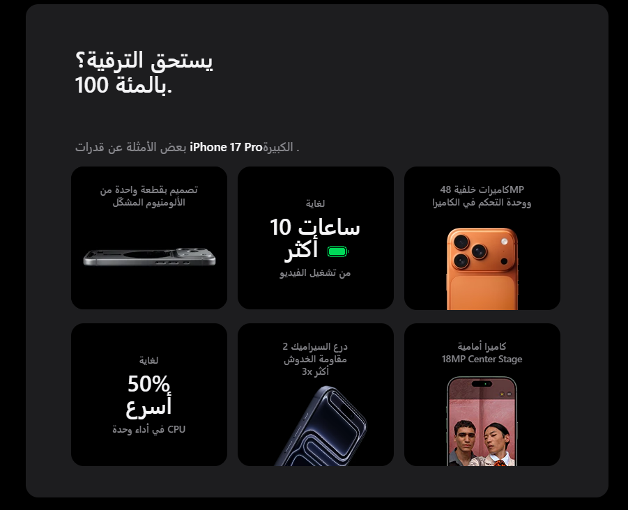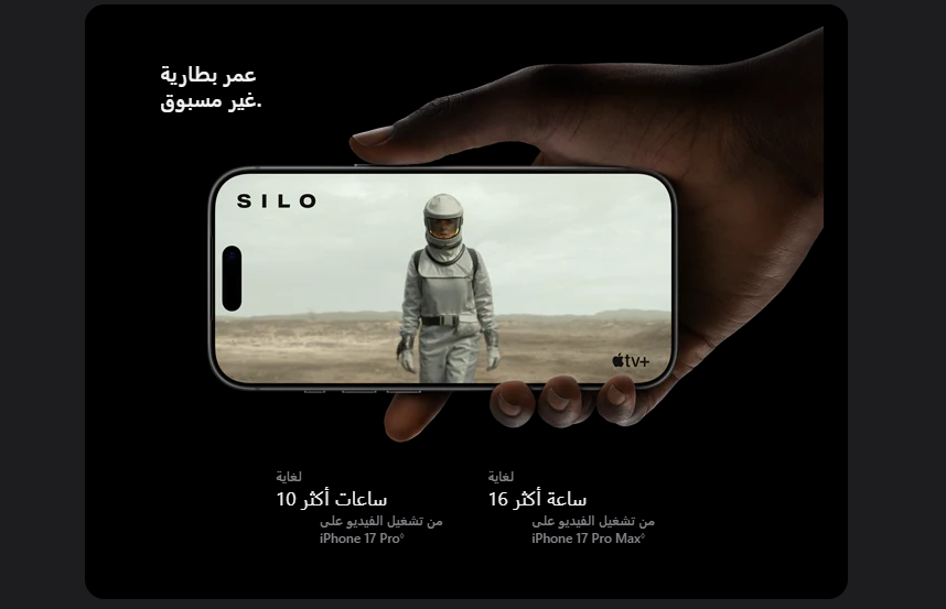 - شحن لغاية 50% خلال 20 دقيقة: أجرت Apple الاختبارات في يوليو 2025 باستخدام وحدات iPhone 17 وiPhone Air وiPhone 17 Pro وiPhone 17 Pro Max خاصة بمرحلة ما قبل الإنتاج وبرامجها، وكابل شحن USB‑C مع محول طاقة ديناميكية بقدرة 40 واط وقدرة قصوى 60 واط من Apple (موديل A3351)، وشواحن MagSafe من Apple (موديل A3502 بطول 1 متر وموديل A3503 بطول 2 متر) مع محول طاقة USB‑C من Apple بقدرة 30 واط (موديل A2164) بالإضافة إلى محول طاقة ديناميكية بقدرة 40 واط وقدرة قصوى 60 واط من Apple (موديل A3351). تم إجراء اختبار الشحن السريع على وحدات iPhone فارغة الشحن. تم قياس الأوقات من لحظة ظهور شعار Apple عند بدء تشغيل الوحدة. تختلف مدة الشحن بحسب محول الطاقة والإعدادات والاستخدام والعوامل البيئية، وتختلف النتائج الفعلية.