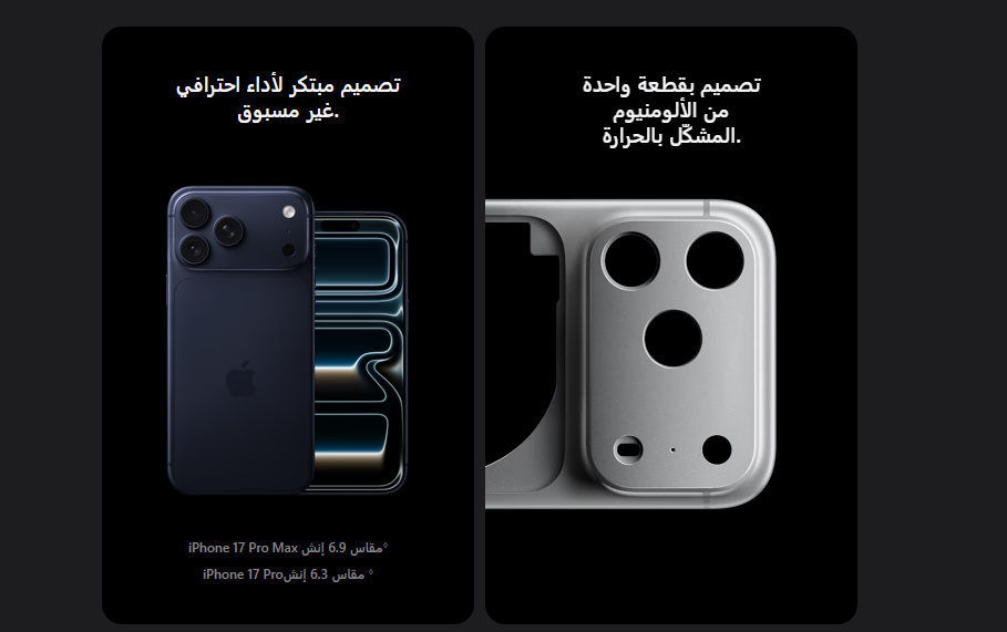 مقاس الشاشة: يتسم تصميم الشاشة بزوايا مدورة. عندما تقاس الشاشة كمستطيل، يكون مقاسها قطرياً 6.86 إنش (iPhone 17 Pro Max)، أو 6.55 إنش (iPhone Air)، أو 6.27 إنش (iPhone 17 وiPhone 17 Pro)، أو 6.06 إنش (iPhone 16e). المساحة الفعلية القابلة للمشاهدة أقل.